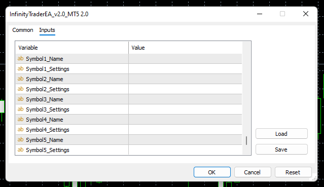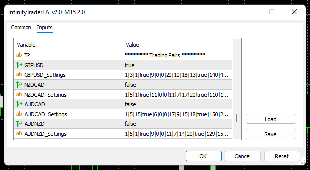 6. Paste them into the pair’s settings field inside Infinity Trader EA.