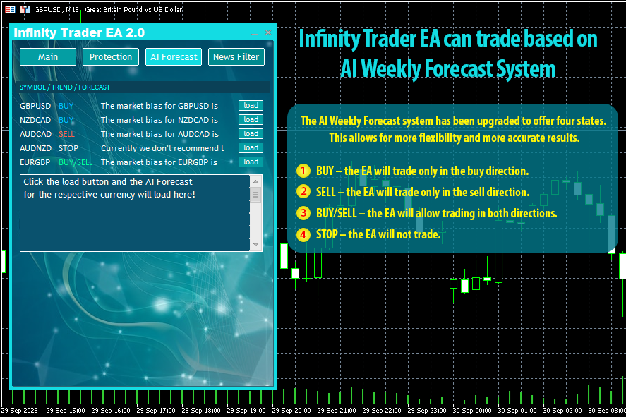 The AI Weekly Forecast system has been upgraded to offer four states: BUY, SELL, BUY/SELL, and STOP. This allows for more flexibility and more accurate results. The forecast is available for all standard supported pairs and even for some unsupported ones, so you can make use of the EA on more instruments.